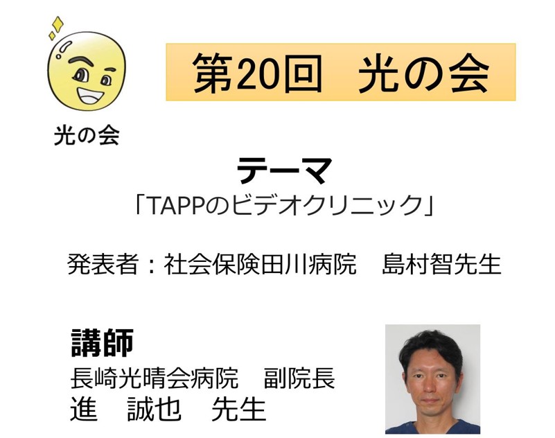 今回は社会保険田川病院の島村智先生にTAPPのビデオクリニックを行っていただきました。TAPPの執刀経験が10例前後で、これからの成長が期待できる島村先生に対して、進先生からの様々なアドバイスがありました。専攻医の先生を始め、関連施設から総勢18名の参加をいただきました。