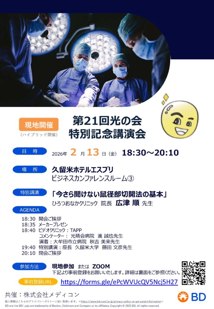 後半はひろつおなかクリニック院長の広津順先生をお招きして「今さら聞けない鼠径部切開法の基本」というテーマでご講演をいただきます。若手に限らず、指導する立場の先生方にも鼠径部切開法を見つめなおすいい機会かと思います。