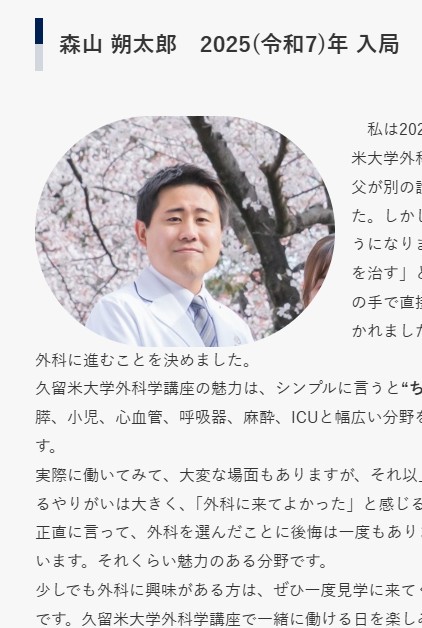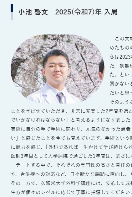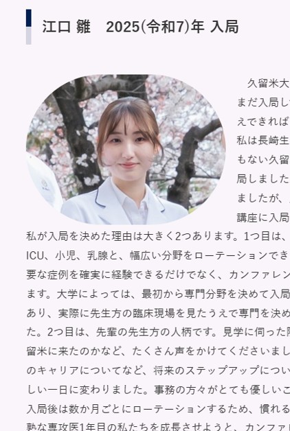 先輩メッセージ・女性医師メッセージに森山 朔太郎先生、小池 啓文先生、江口 雛先生を掲載しました 2026 4/14 お知らせ 今春、専攻医2年目となった3名の先生方から後輩の皆様へメッセージをお届けします。 お知らせ